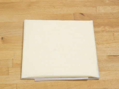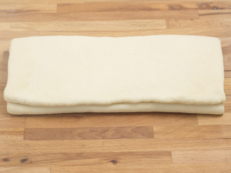 7. Roll the dough into a 10 x 15 inch (25 x 38 centimetres) rectangle about ¼ inch (6 millimetres) thick. Position the dough so the short side is closest to you and fold the top ? down over the middle of the dough. Fold the bottom ? over the first fold (like folding a letter) and turn the dough 90 ° so the opening is on your right hand side. This completes one turn of the dough. Wrap and chill for 30 minutes. Repeat folding, turning and chilling, then fold once more, turn and chill overnight.