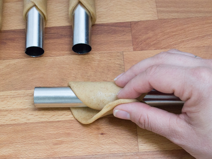 Wrap cannoli tubes with a circle of dough and brush with egg white on one edge. Slightly stretching the dough, overlap the edges and press to seal.