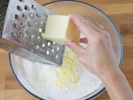 Using a box grater, quickly grate the frozen butter into the dry ingredients. With a fork or hands, toss the butter into the dry ingredients.
