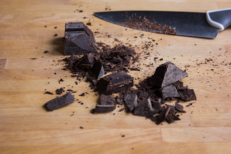 3. Chop the chocolate. Place chopped chocolate and butter in a medium-sized saucepan and melt together over low heat. Transfer to a small bowl and set aside.