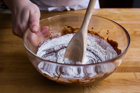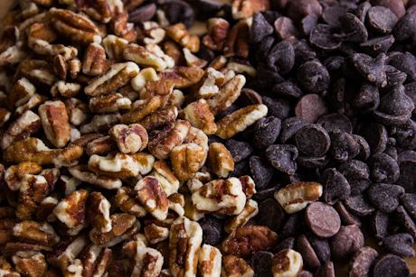 6. Stir in the flour mixture, then the chocolate chunks and nuts.