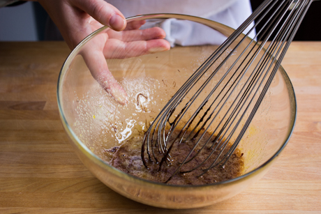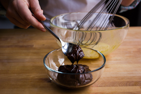5. Briskly whisk a small amount of the melted chocolate into the egg mixture, then slowly add in the remaining chocolate while whisking.
