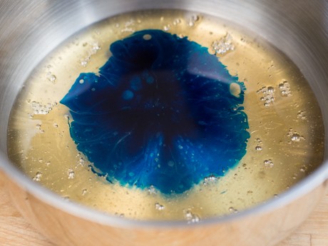 6. Remove the pan from the heat immediately and let the syrup cool to about 275°F (135°C), and the trick is that when you lift a spoon from the sugar mixture, it pours and leaves a thread on top of the surface of the melted sugar, and isn't extremely fluid like when you first took it off the heat. At this stage, stir in some gel food colouring.