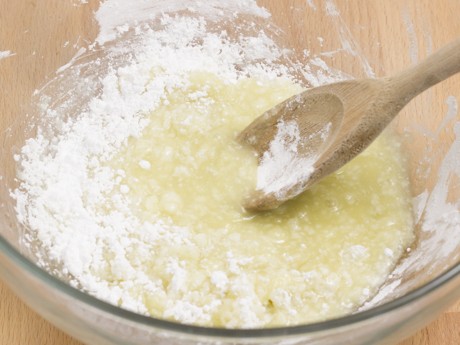 3. Start adding Redpath® Icing Sugar to the mashed potato, 1 cup (120 g) at a time, stirring well with a wooden spoon after each addition. The mixture will be quite thin and watery at first, but will begin to thicken after the first 2 cups of Redpath ® Icing Sugar are added. Continue adding Redpath® Icing Sugar as needed until mixture becomes a stiff, kneadable dough.