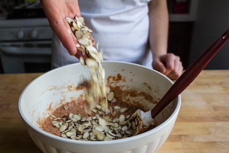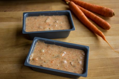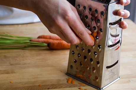 5. Grate the carrots, then add to the cake batter and stir in. Stir in the nuts.
