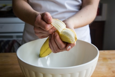 3. Whisk the sugar and oil into the mashed bananas, until the mixture is thick and creamy.
