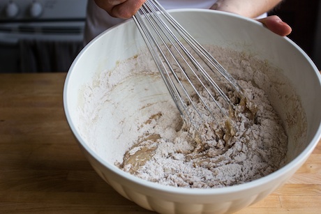 4. Whisk together the flour, baking soda, cinnamon, and salt. Add to the wet ingredients and mix together until well incorporated.