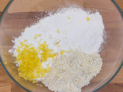 In a medium bowl, whisk together the flour, almond flour, lemon zest, and salt. Set aside.