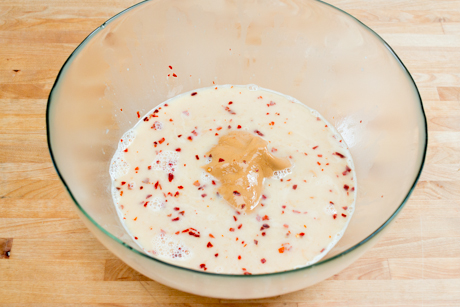 3. Once the sugar is dissolved into the coconut milk remove it from the heat then carefully pour it into the bowl with the peanut butter. Allow the mixture to rest for 2 minutes.