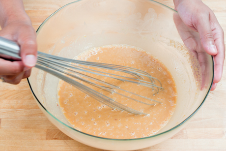4. Using a whisk, begin stirring together the peanut butter and the coconut milk mixture. Start slow to prevent splashes. Slow stirring will also allow the mixture to emulsify and thicken properly.