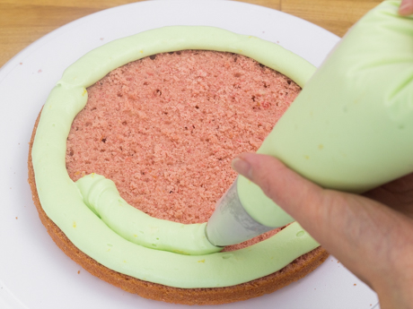 2. Place one of the bottom layers onto the cake stand or platter. Transfer some of the cream cheese buttercream into a piping bag fitted with a round tip. Pipe concentric circles onto the layer, and with a small offset spatula smooth out the buttercream.
