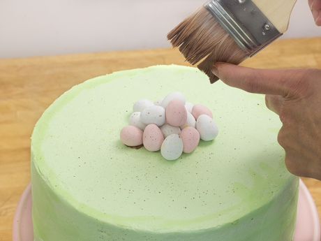 8. With a clean pastry brush, dip into the speckling paint and remove excess “paint ” by pressing the bristles against the rim of the bowl. Holding the brush with the bristles parallel to the surface of the buttercream, run a finger across the bottom of the bristles. Practice a few times on a plate or piece of parchment paper, before trying it out on the cake.