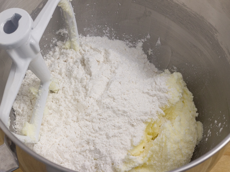 5. Add half of the flour mixture and blend until it starts to combine, then add the remainder of the dry ingredients and blend until the mixture looks like coarse breadcrumbs. Pour in the milk. Blend on low, while increasing the speed to medium and mixing until it comes together; about 1 minute.