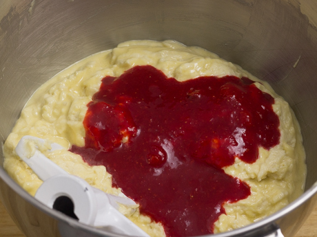 6. Add half of the egg mixture, mixing until fully incorporated before adding the rest of the egg mixture. Before the egg mixture is fully mixed, add the strawberry puree. Mix until batter is thoroughly combined; do not overmix.