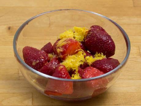 1. In a food processor, or using a hand-held blender, puree strawberries with lemon zest and lemon juice until smooth. Stir in a few drops of red gel food colouring. Set aside.