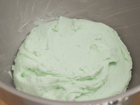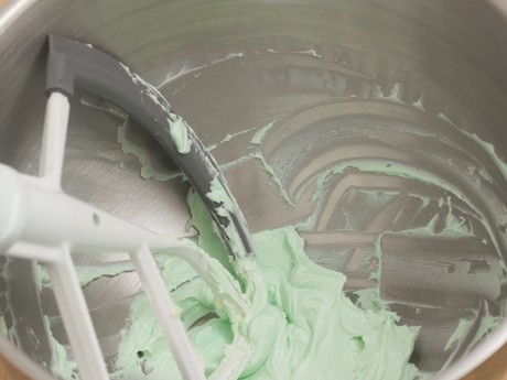 2. Ajouter le beurre fondu au fromage à la crème et bien incorporer. Ajouter les extraits et un peu de colorant en gel (utiliser un cure-dent, car la pigmentation des colorants en gel est prononcée). Continuer à mélanger jusqu'à l'obtention d'une couleur homogène.