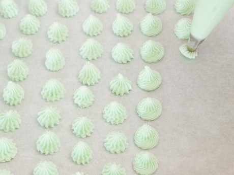4. Transférer la préparation dans une poche à pâtisserie munit d’une douille étoilée. Tracer de petits becs sucrés directement sur le papier parchemin. Laisser sécher à température pièce pendant quatre heures.