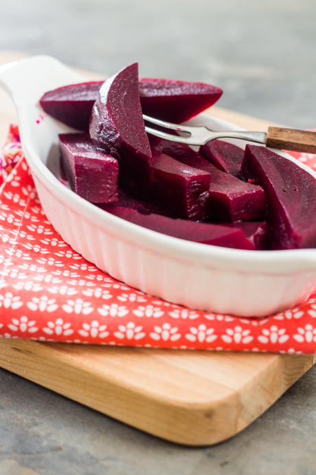 1. Dans une grande casserole d’eau bouillante salée, couvrir et cuire les betteraves jusqu’à ce que vous puissiez facilement les percer avec une fourchette, mais qu’elles soient encore fermes, pendant environ 25 à 30 minutes. Égouttez et laissez refroidir légèrement. Décollez la peau. Coupez-les en morceaux d’un pouce.