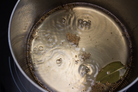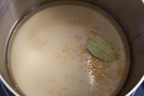 3. Dans une casserole, portez le vinaigre, le sucre, les graines de moutarde et les feuilles de laurier à ébullition. Faire bouillir doucement pendant 5 minutes. Retirez les feuilles de laurier.