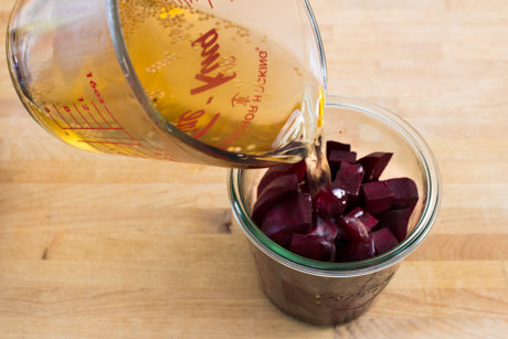 2. Remplir 4 bocaux de 2 tasses (500 ml) avec de l’eau bouillante. Laissez reposer pendant environ 5 minutes, puis égouttez. Remplir les bocaux stérilisés avec des betteraves hachées.