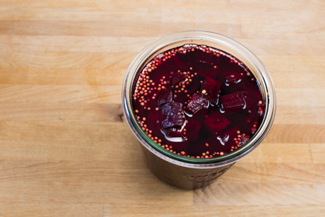 4. Divisez le liquide entre les pots pour couvrir les betteraves; sceller avec les couvercles stérilisés dans l’eau bouillante et laissez refroidir. Une fois refroidi, réfrigérez pendant 24 heures avant l’ouverture. Vous pouvez conserver les betteraves jusqu’à un mois au réfrigérateur.