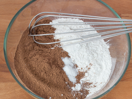 Fouetter la farine, la poudre de cacao, le sel et la poudre à pâte dans un bol moyen.