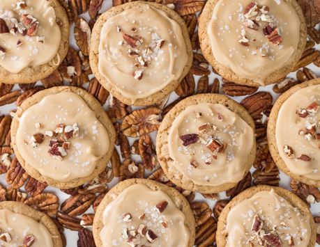 Étendre environ 2 cuillères à thé de glaçage par biscuit et remettre sur la grille. Saupoudrer immédiatement de pacanes rôties et de fleur de sel avant que le glaçage ne durcisse.