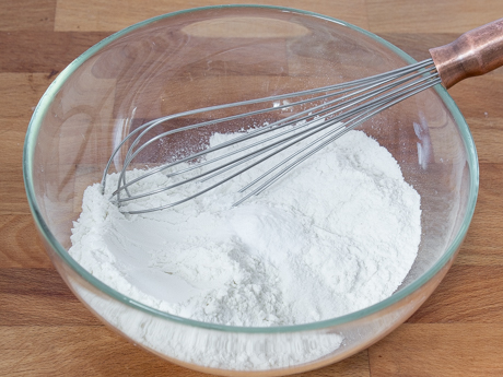 Fouetter les farines, le bicarbonate de soude, le sel et la poudre à pâte dans un bol moyen.