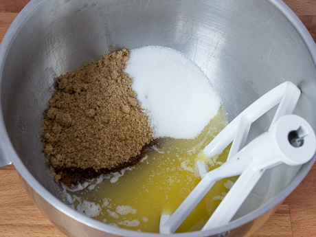 Mettre le beurre fondu dans le bol d’un batteur sur socle muni du fouet plat. Ajouter la Cassonade Foncée Redpath® et le Sucre Granulé Redpath®. Mélanger à vitesse moyenne pendant une minute.