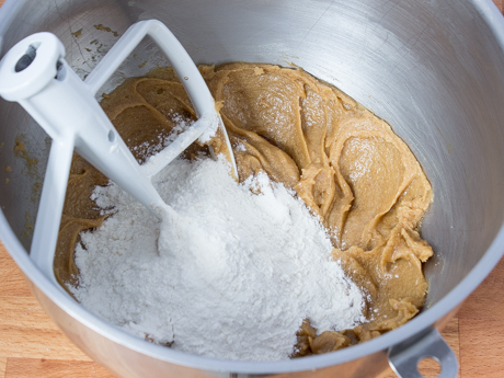 Ajouter la moitié des ingrédients secs et mélanger à basse vitesse jusqu’à ce que les ingrédients soient tout juste incorporés. Ajouter le reste des ingrédients secs et mélanger à vitesse moyenne-élevée pendant deux minutes.