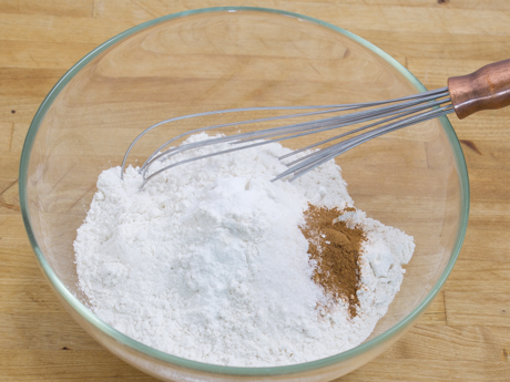 Fouetter dans un grand bol la farine, la cannelle, le sel, le bicarbonate de soude et la poudre à pâte. Réserver.