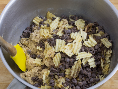 Ajouter en pliant les croustilles écrasées et les brisures de chocolat à l’aide d’une spatule en caoutchouc.