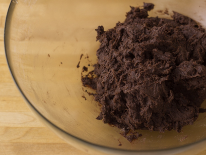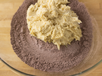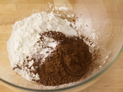 2. Dans une grand bol, combiner la farine, la poudre de cacao, le bicarbonate de soude et le sel. Réserver.