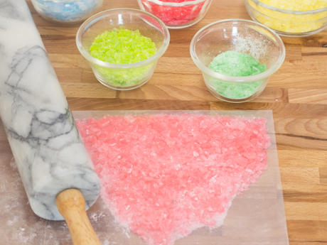 Mettre les bonbons de la même couleur dans un sac à congélation et écraser à l’aide d’un rouleau à pâte afin d’obtenir des morceaux de ¼ pouce (6 millimètres). Transférer dans un petit bol et répéter avec les autres couleurs.