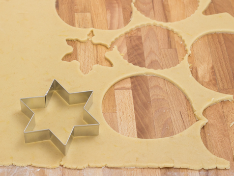 Sur une surface légèrement farinée, rouler la pâte à une épaisseur de ⅛ pouce (3 millimètres). Découper avec les emporte-pièces de votre choix et déposer sur la plaque à biscuits. Découper l’intérieur des biscuits avec des emporte-pièces plus petits. Si vous voulez suspendre les biscuits, découper un petit trou afin d’y faire passer un ruban. Rouler la pâte jusqu’à utilisation complète. Mettre au congélateur pendant 15 minutes avant de cuire.