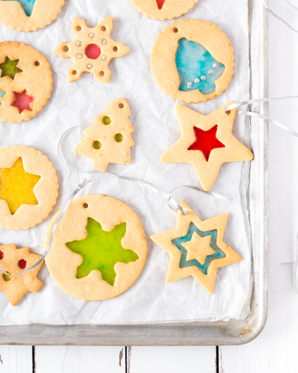 Cuire les biscuits pendant huit minutes puis remplir les trous avec les bonbons à l’aide d’une cuillère. Éviter de mettre des bonbons sur la surface des biscuits. Si désiré, ajouter des boules décoratives argentées en les pressant légèrement dans la pâte. Poursuivre la cuisson pendant huit minutes ou jusqu'à ce que les bonbons soient fondus. Laisser tempérer complètement sur la plaque. Retirer délicatement de la plaque en tenant le papier parchemin. Dégustez ou utilisez comme décoration.