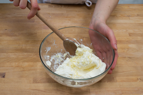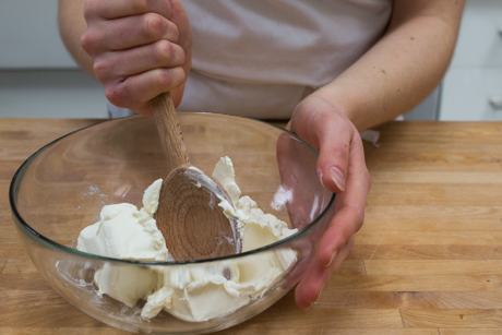 Dans un bol de taille moyenne, battre le fromage à la crème jusqu’à ce qu’il devienne doux et lisse.