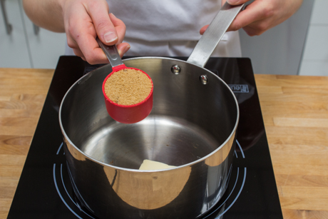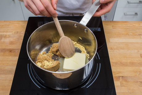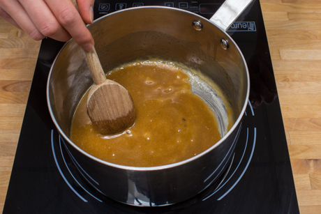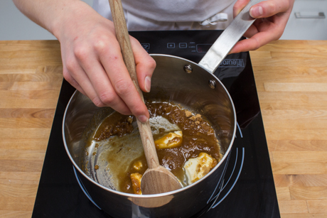 Dans une casserole moyenne, mélanger le beurre, la cassonade et la moutarde sèche. Cuire à feu moyen jusqu’à ce que le mélange commence à faire des bulles, en remuant constamment pendant tout ce temps.