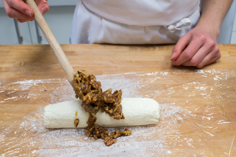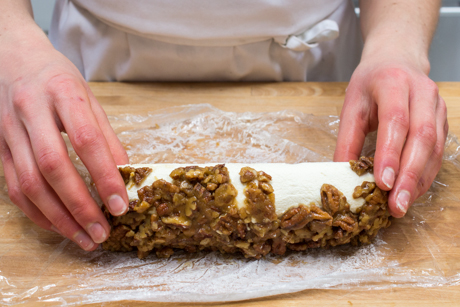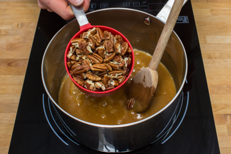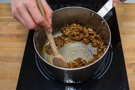 Une fois que le mélange commence à faire des bulles, baisser le feu et ajouter les pacanes hachées. Poursuivre la cuisson à feu doux, en remuant constamment, jusqu’à ce que les noix soient entièrement couvertes et qu’elles aient absorbé le mélange. Retirer du feu et assembler le rouleau fromagé.