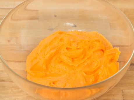 - Mélanger dans un bol moyen le beurre avec ½ tasse (125 g) de Sucre à Glacer Redpath®. Ajouter ensuite graduellement le reste du sucre à glacer et bien incorporer. Ajouter la crème et la vanille et mélanger. Diviser le glaçage en partie égale dans deux bols. Ajouter le colorant orange dans l'un des bols et bien mélanger. Réserver l'autre bol de glaçage.