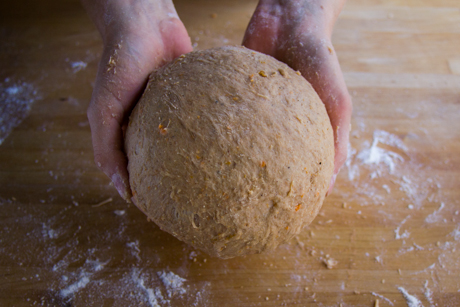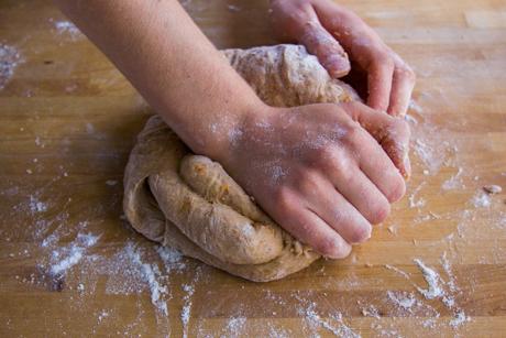 7. Dès que la pâte se tien ensemble, mettez la sur une surface lisse légèrement enfarinée et pétrir avec vos mains jusqu’à ce que la pâte prenne une texture lisse et élastique. Former une boule.