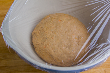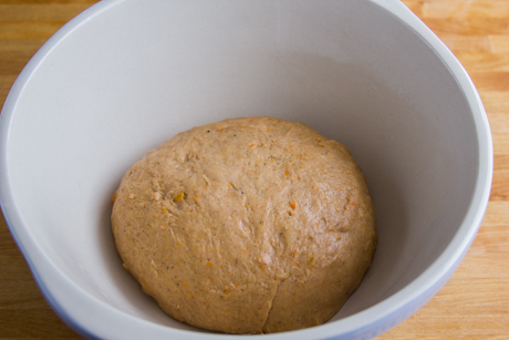 8. Huiler un gros bol et y placer la boule de pâte. Couvrir le bol avec une pellicule plastique ou une serviette humide, puis laisser dans un endroit chaud afin que la pâte lève.