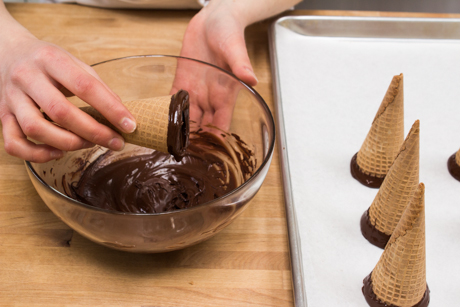 1. Tapisser une plaque de cuisson de papier parchemin ou de papier ciré et mettre de côté. Faire fondre le chocolat au micro-ondes à 30 secondes d’intervalle, en remuant entre chaque intervalle jusqu’à ce que le chocolat soit complètement lisse. Trempez l’extrémité ouverte de chaque cône dans le chocolat fondu, puis transférer sur la plaque de cuisson recouverte de papier parchemin. Une fois que tous les cônes ont été trempés dans le chocolat, les mettre de côté pour mettre tout en préparant le remplissage.