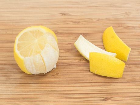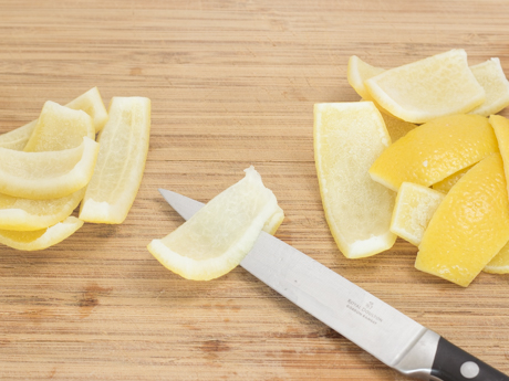 - Couper les extrémités des citrons et à l'aide d'un couteau d'office, retirer la pelure du haut vers le bas pour obtenir huit sections. Retirer ensuite la partie blanche de la pelure pour conserver uniquement le zeste.