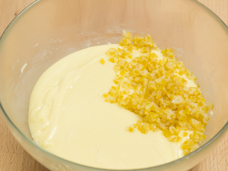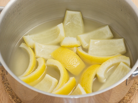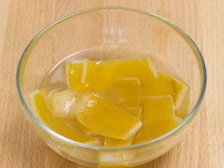 - Mettre dans une petite casserole et couvrir d'eau froide puis faire mijoter 10 minutes. Égoutter et répéter cette étape une deuxième fois. Égoutter à nouveau et ajouter le Sucre Granulé Redpath® et l'eau et laisser mijoter pendant 40 minutes. Laisser tempérer dans un bol avec le sirop. Couper six écorces de citron en petits dés d'environ ⅛ po (3 mm) et deux écorces en bandes de ½ po (1.2 cm) de long. Réserver.