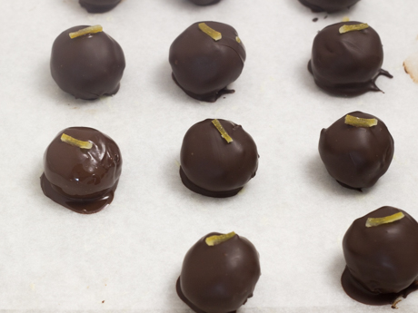 - Tempérer le chocolat selon les indications ci-dessous. Enrober les truffes de chocolat noir et retirer à l'aide d'une fourchette. Retirer l'excédent de chocolat en appuyant sur les côtés du bol. Transférer sur une plaque à biscuits recouverte de papier parchemin et déposer une bande de citron confit. Laisser figer à température pièce.