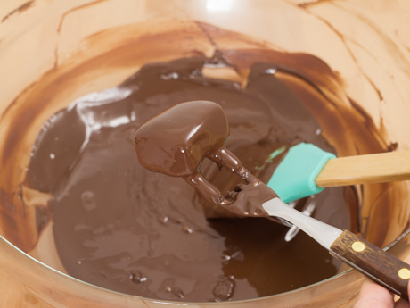 Une fois la température de cristallisation atteinte, remettre le bol sur la casserole pendant environ 10 secondes pour atteindre la température d'utilisation en brassant constamment. Utiliser le chocolat immédiatement en le réchauffant de la même façon au besoin pour le ramener à la température d'utilisation.