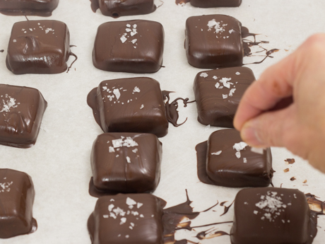 - Tempérer le chocolat selon les indications ci-dessous. À l'aide d'une fourchette, tremper les caramels dans le chocolat, bien enrober et retirer l'excédent de chocolat en appuyant sur les côtés du bol. Transférer sur une plaque à biscuits recouverte d'un papier parchemin et saupoudrer de sel de mer. Laisser figer à température pièce.