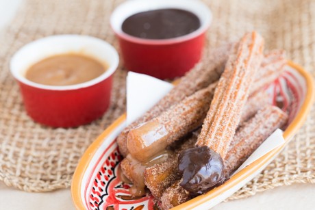 Churros avec une sauce cajeta et ganache au chocolat