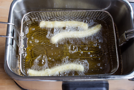 7. Une fois que l’huile est chauffée, laisser tomber 4 segments de pâte de 8” dans l’huile chaude. Utiliser des ciseaux pour couper les segments de pâte. Utiliser des pinces pour redresser la pâte, si nécessaire, et pour empêcher les segments de coller les uns aux autres. Faire très attention à ne pas vous brûler. Faire frire la pâte pendant 5-7 minutes, jusqu’à coloration dorée.